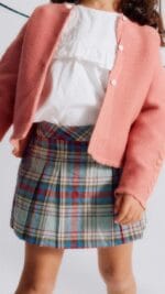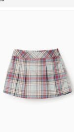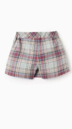 Falda pantalón para niña de la marca Zippy, con elegante estampado de cuadros en tonos verdes suaves, crudo y sutiles líneas rosadas. Diseño con tablones delanteros que simulan una falda clásica, pero con la comodidad de un pantalón corto en la parte interior, ideal para el día a día. Cierre lateral con cremallera invisible y cintura ajustable para un mejor ajuste.