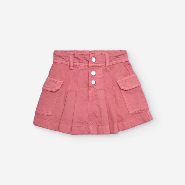 Falda de niña en color rosa, con bolsillos laterales tipo cargo y cierre delantero con botones metálicos. Ideal para looks urbanos y cómodos esta temporada.