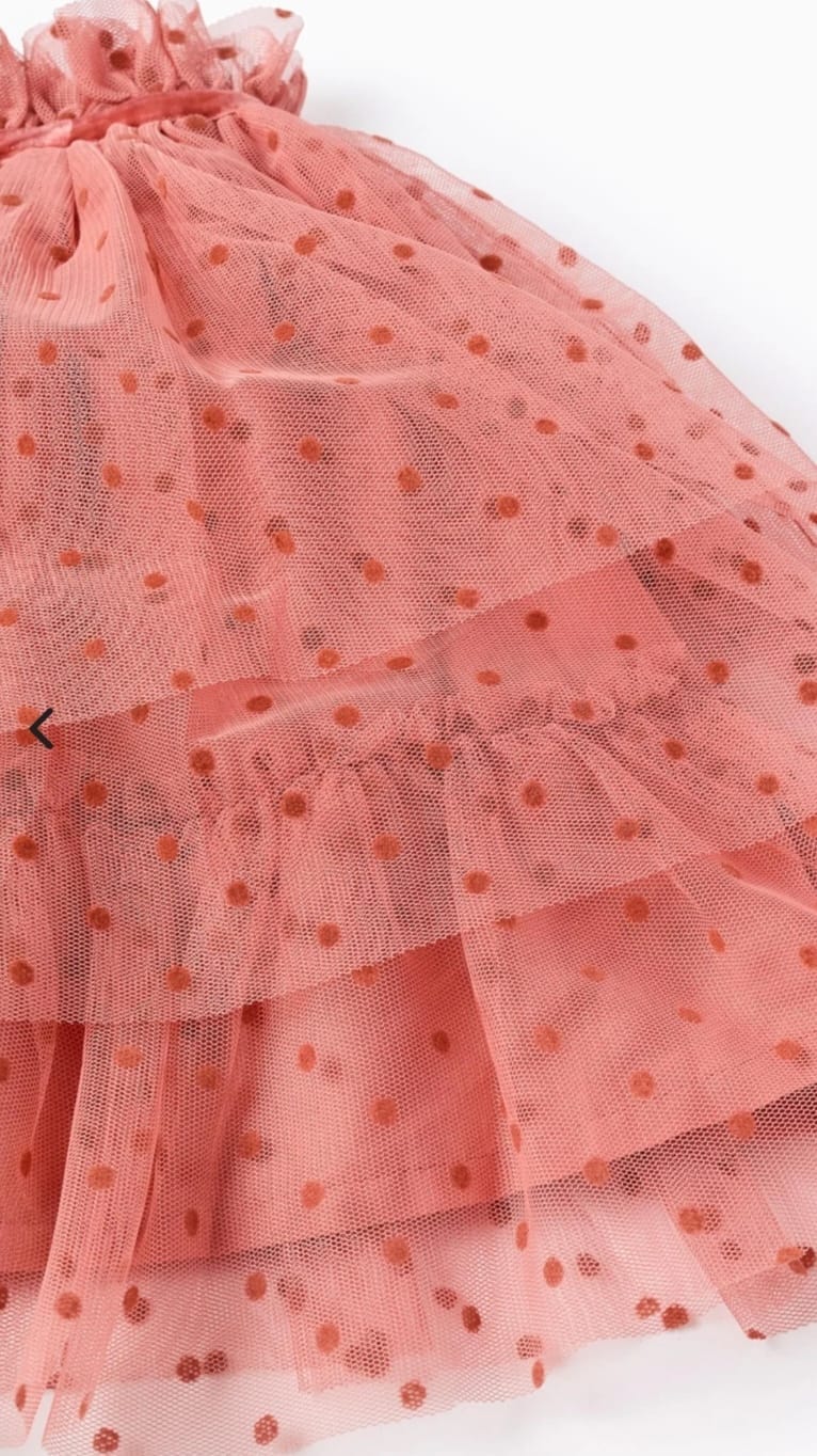 Falda de tul para niña en un bonito tono rosa empolvado, decorada con topos bordados en relieve. Diseñada con varias capas de tul suave que aportan volumen y movimiento sin perder comodidad. La cintura es elástica y está rematada con un detalle de terciopelo, aportando un toque delicado y elegante. Ideal para celebraciones, sesiones de fotos o para cualquier look especial. Combínala con una blusa blanca o un jersey sencillo y convierte cualquier día en una ocasión especial.