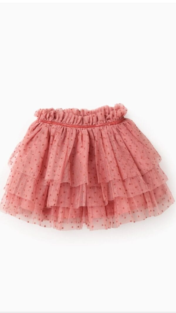 Falda rosa para niña con capas de tul bordado de topos, ideal para ocasiones especiales. Cintura elástica con detalle de terciopelo. Cómoda, ligera y con mucho vuelo.