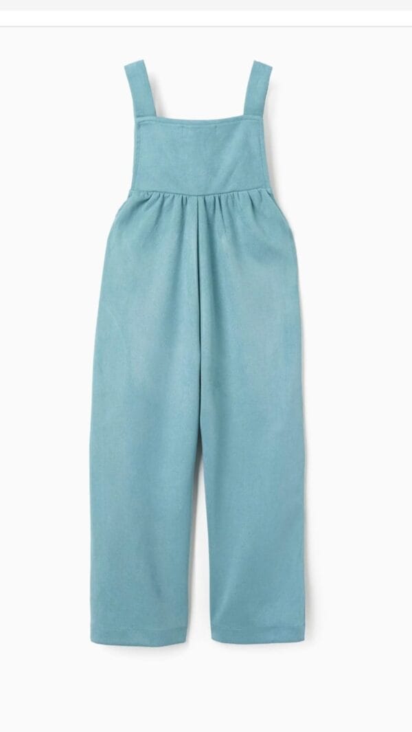 Peto infantil para niña en precioso color azul, confeccionado en tejido de ante suave al tacto. Lleva tirantes anchos con botones de madera, cinturilla fruncida que se adapta con comodidad y pierna recta. Un modelo ideal para el día a día o para vestir con estilo en cualquier ocasión. Combínalo con camisetas de manga larga o jerséis finos para un look de temporada. Disponible desde la talla 3/4 años hasta la 13/14 años.