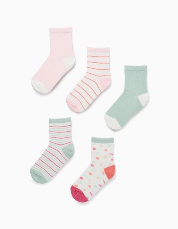 Pack de 5 pares de calcetines para niña de la marca Zippy. Incluye diseños variados en tonos pastel: lisos, a rayas y estampados divertidos. Fabricados en tejido suave y elástico para mayor comodidad diaria.