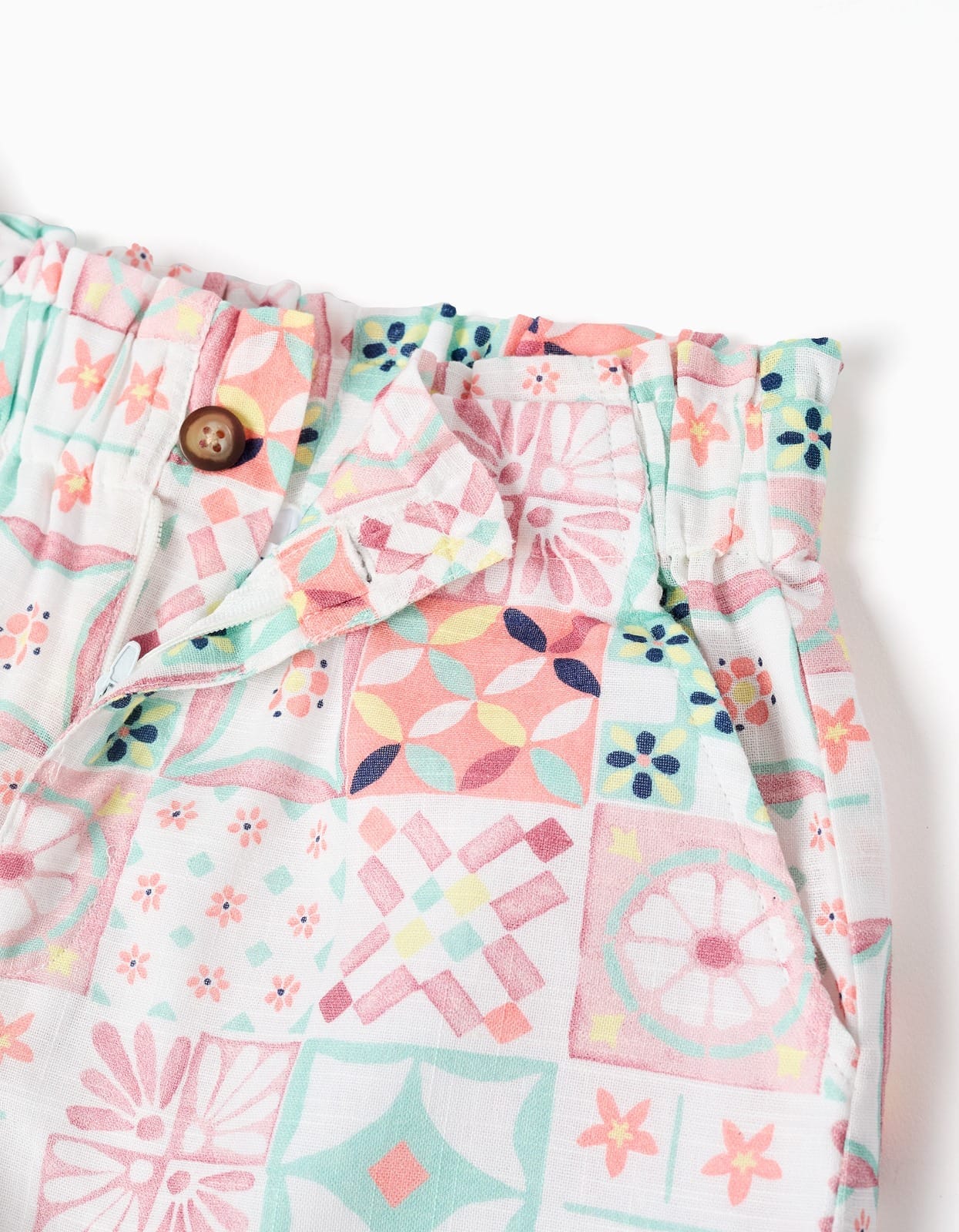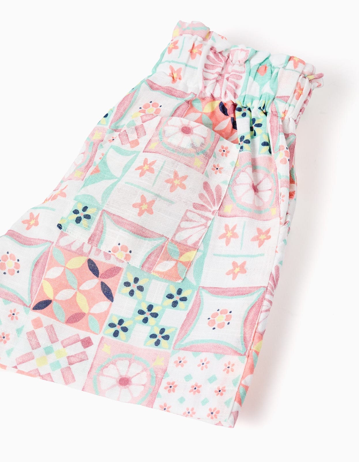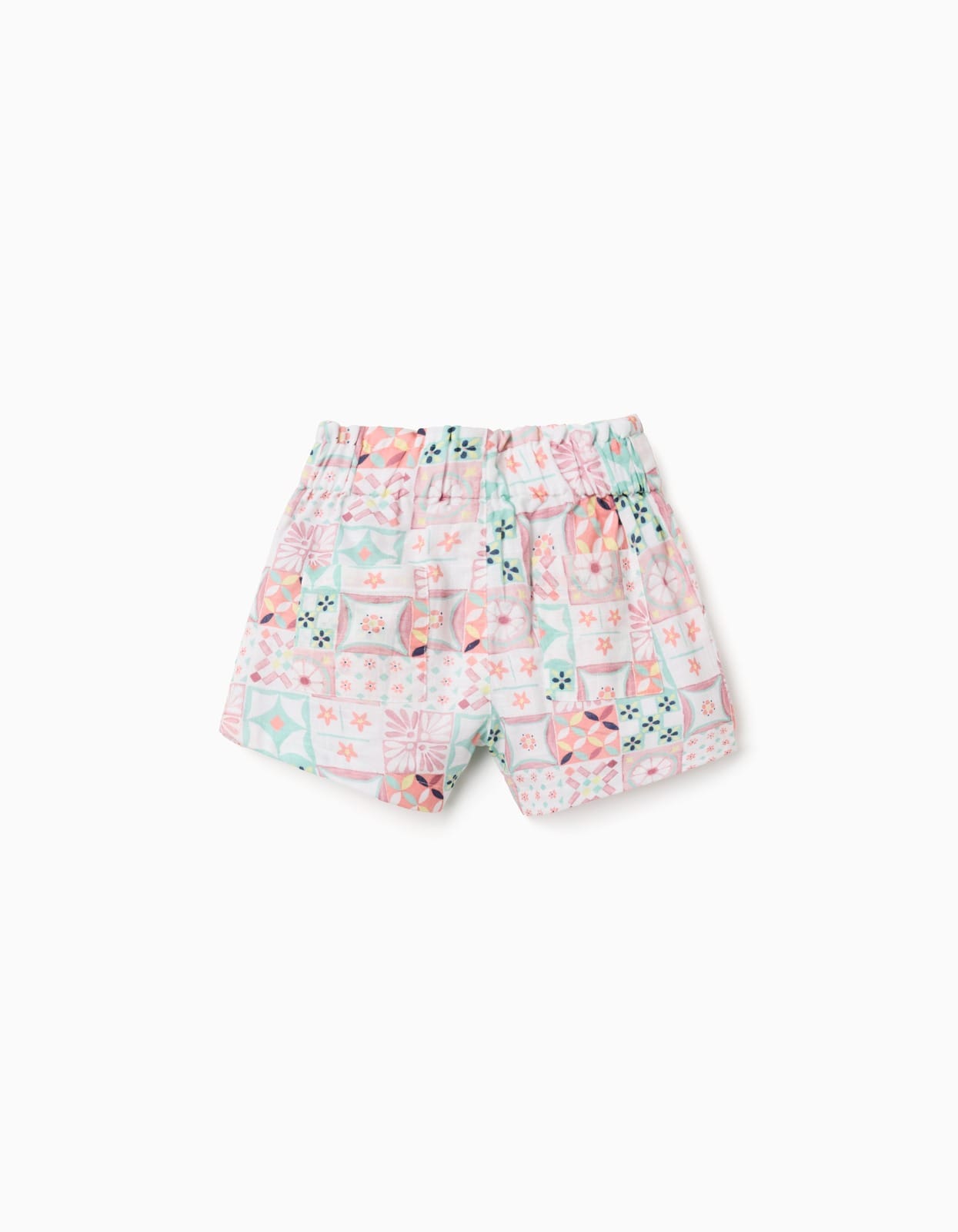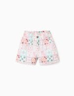 Short para niña de la marca Zippy confeccionado en tejido ligero y transpirable, perfecto para los días más cálidos. Presenta un estampado geométrico estilo mosaico en tonos suaves como rosa, coral y verde agua, que aporta un toque divertido y veraniego.