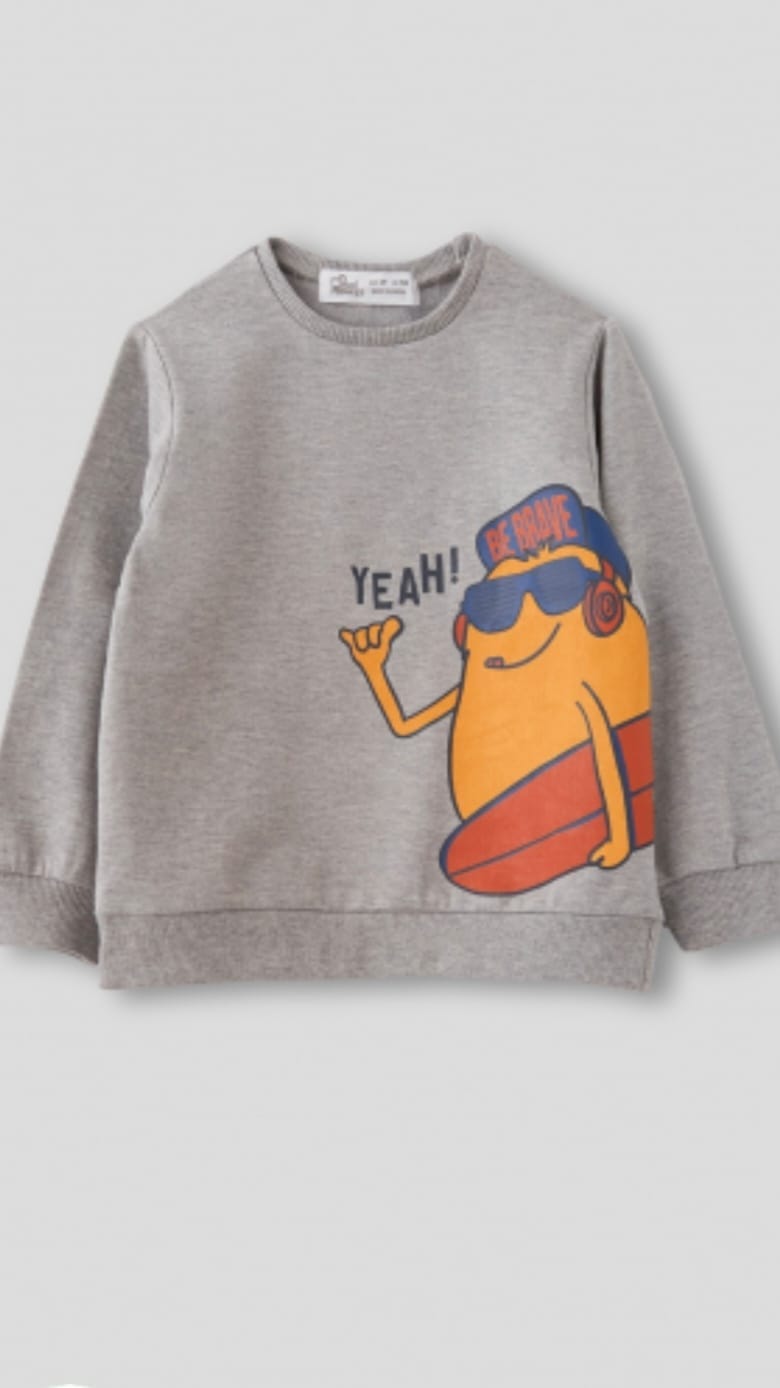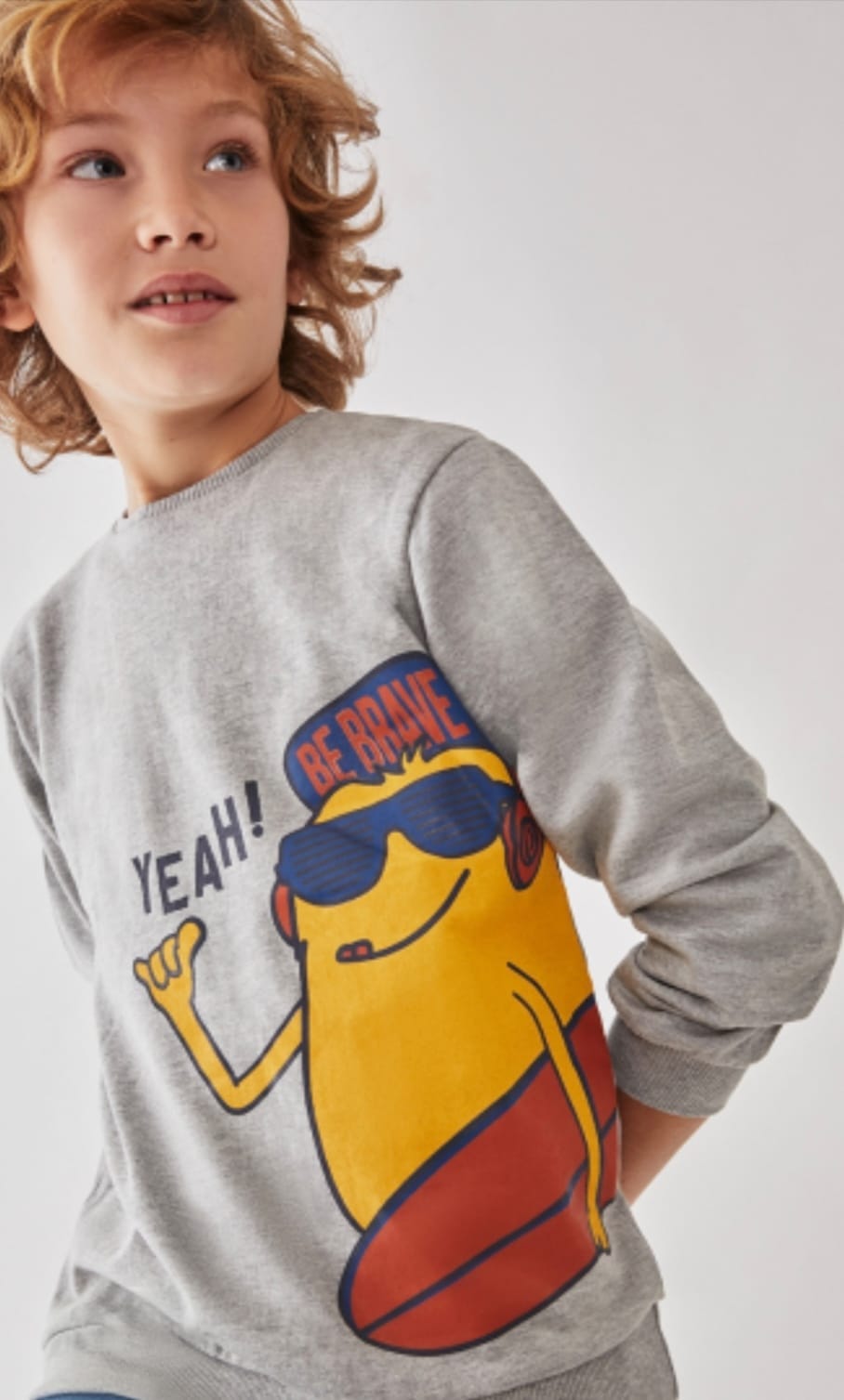 Sudadera infantil en tono gris con un estampado grande y muy divertido en la parte delantera, que incluye un personaje con gorra, gafas y tabla de surf acompañado del mensaje “Yeah!” y “Be Brave”.