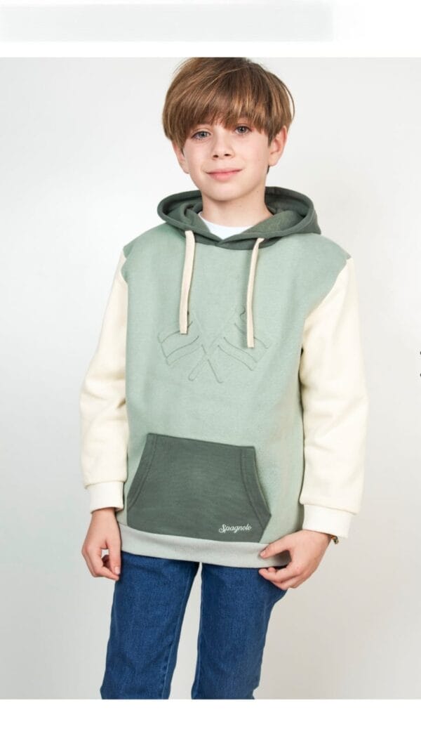 Sudadera para niño en tonos verde y crudo con capucha y bolsillo delantero. Moderna, cómoda y con el sello característico de Spagnolo.
