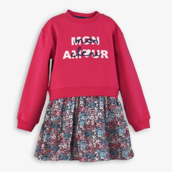 Vestido Nelblu para niña, con cuerpo tipo sudadera en color fucsia intenso y estampado frontal “Mon Amour” en blanco y azul marino.