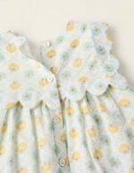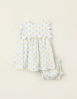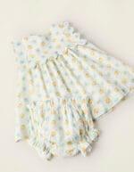 Un Vestido dulce y encantador para las más pequeñas. Este Vestido y braguita destaca por su delicado estampado floral en tonos pastel, ideal para la primavera y el verano. El vestido sin mangas con volantes y detalle festoneado le da un toque especial, mientras que el cierre trasero con botones facilita su colocación. La braguita a juego, con cintura y perneras elásticas, garantiza comodidad y ajuste perfecto.