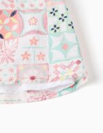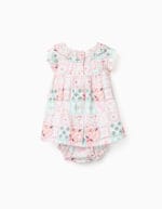 Conjunto de bebé compuesto por vestido y braguita a juego con un alegre estampado geométrico en tonos suaves. Un diseño cómodo y fresco, ideal para los días de primavera y verano.