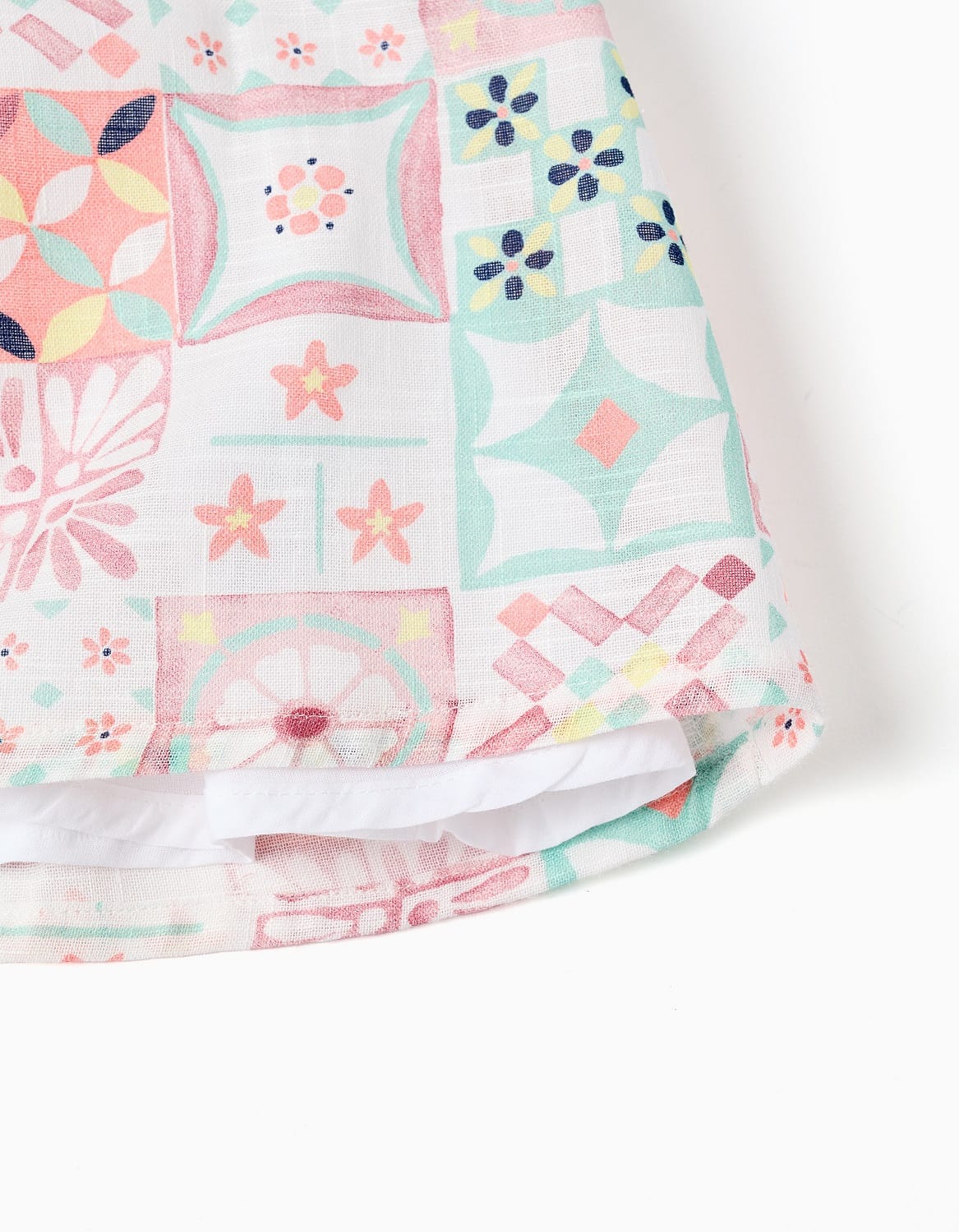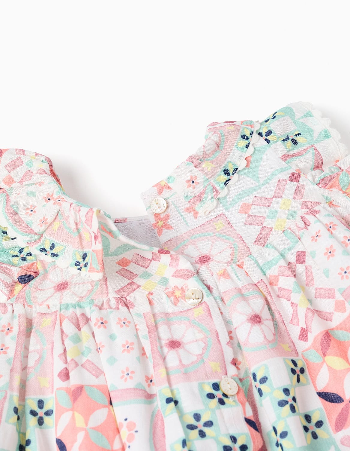 El vestido presenta un estampado geométrico multicolor en tonos pastel que aporta un aire dulce y alegre. Cuenta con cuello con volante, mangas cortitas con detalle de volante y botones delanteros que facilitan el cambio de ropa. Su corte suelto permite total libertad de movimiento para el bebé.