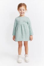 Este tierno vestido de bebé niña de Street Monkey combina estilo y comodidad. Confeccionado en suave algodón, presenta un encantador color verde agua con estampado de patitos blancos, manga larga y un delicado lazo decorativo en el pecho. Incluye braguita a juego para mayor comodidad y cobertura.