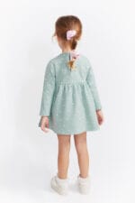 Vestido verde agua con estampado de patitos, lazo decorativo y braguita a juego. Dulce y cómodo para bebés de 1 a 24 meses. Marca Street Monkey – Ref. 351032.