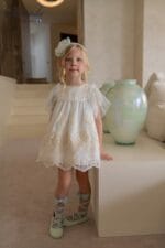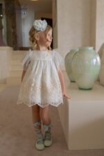 Confeccionado en un suave tono claro, destaca por sus bordados delicados en la falda y su espectacular bajo con encaje, que aporta un acabado artesanal y muy elegante. Las mangas de tul con plumeti y volantes añaden ligereza y un toque romántico al conjunto.