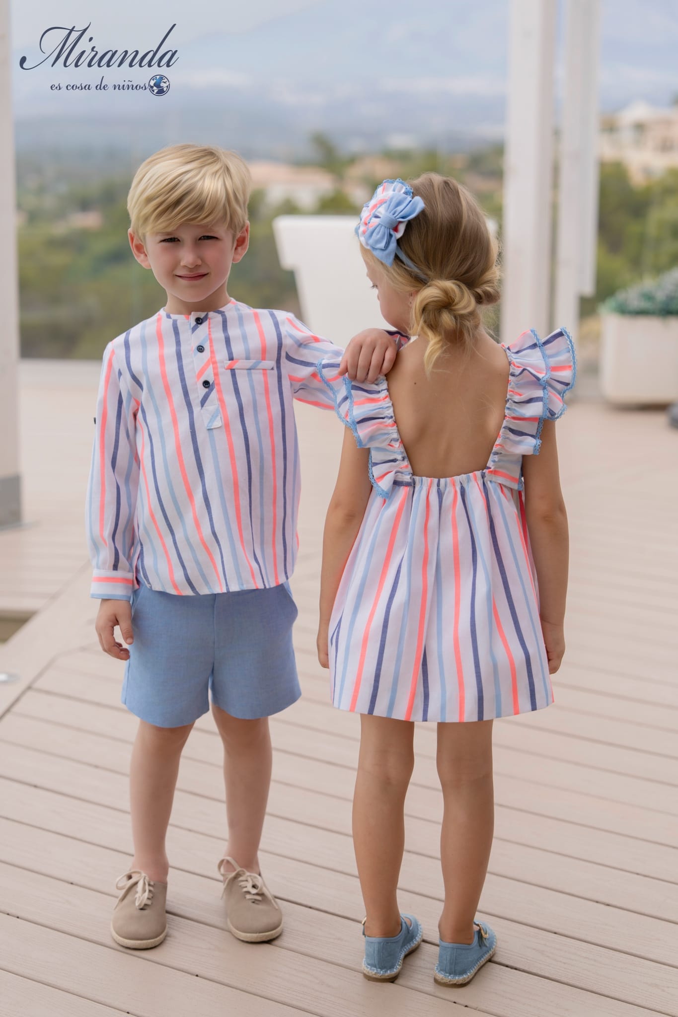 Vestido de niña Miranda Ref. 244/V con estampado de rayas en tonos celeste, coral y blanco. Fresco, cómodo y perfecto para primavera y verano.