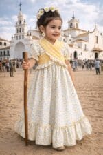 Perfecto para el Rocío, ferias o días especiales, este vestido destaca por su color luminoso que favorece muchísimo y aporta un toque diferente dentro de la moda flamenca infantil.