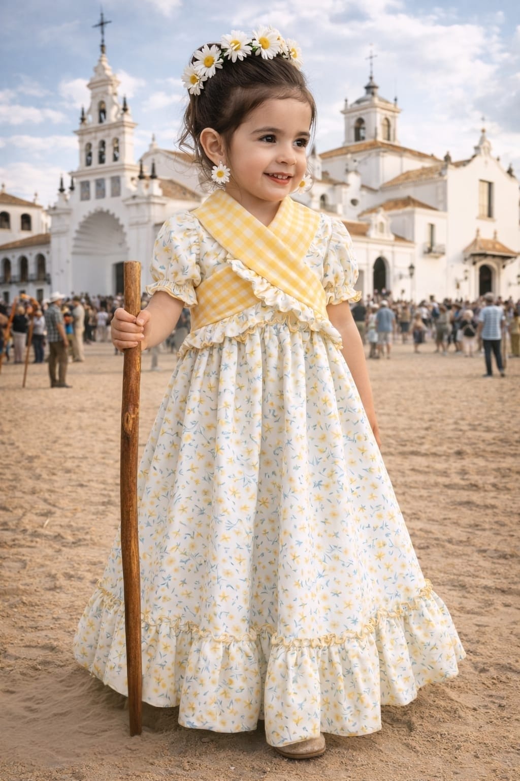 El vestido Sol de Romería es pura luz y alegría. Con su delicado estampado floral en tonos suaves y el detalle de cuadro vichy amarillo en el pecho, transmite ese aire fresco y dulce tan característico de las romerías.