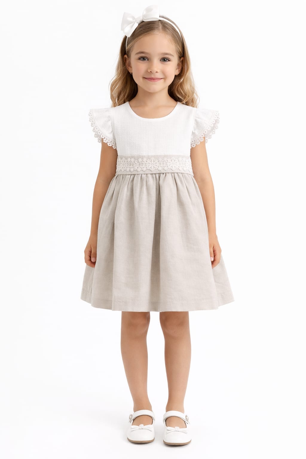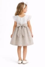 Vestido elegante para niña en tonos beige y blanco con detalle de encaje y lazo trasero. Ideal para ceremonias y ocasiones especiales.