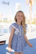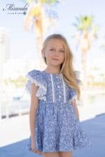 Vestido para niña de la marca Miranda, confeccionado en un delicado tejido estampado de pequeñas flores en tonos azules que aporta un estilo dulce y elegante.