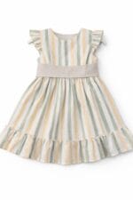 Vestido para niña con estampado de rayas en tonos suaves verdes y beige, con lazo trasero. Fresco, cómodo y perfecto para verano.