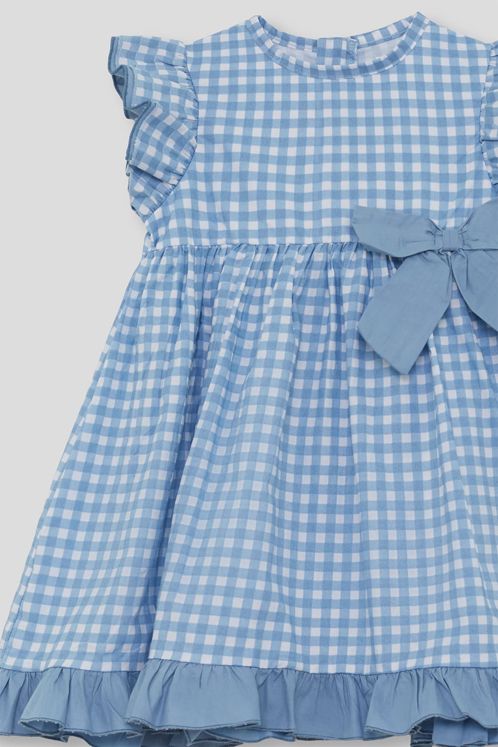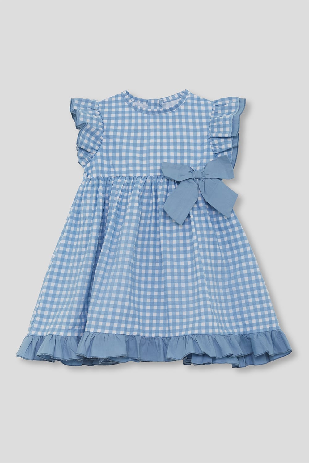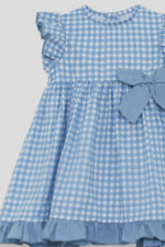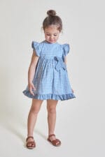 Vestido infantil en estampado vichy azul con volante en mangas y bajo, y bonito lazo lateral decorativo. Ideal para eventos, celebraciones y looks de verano.