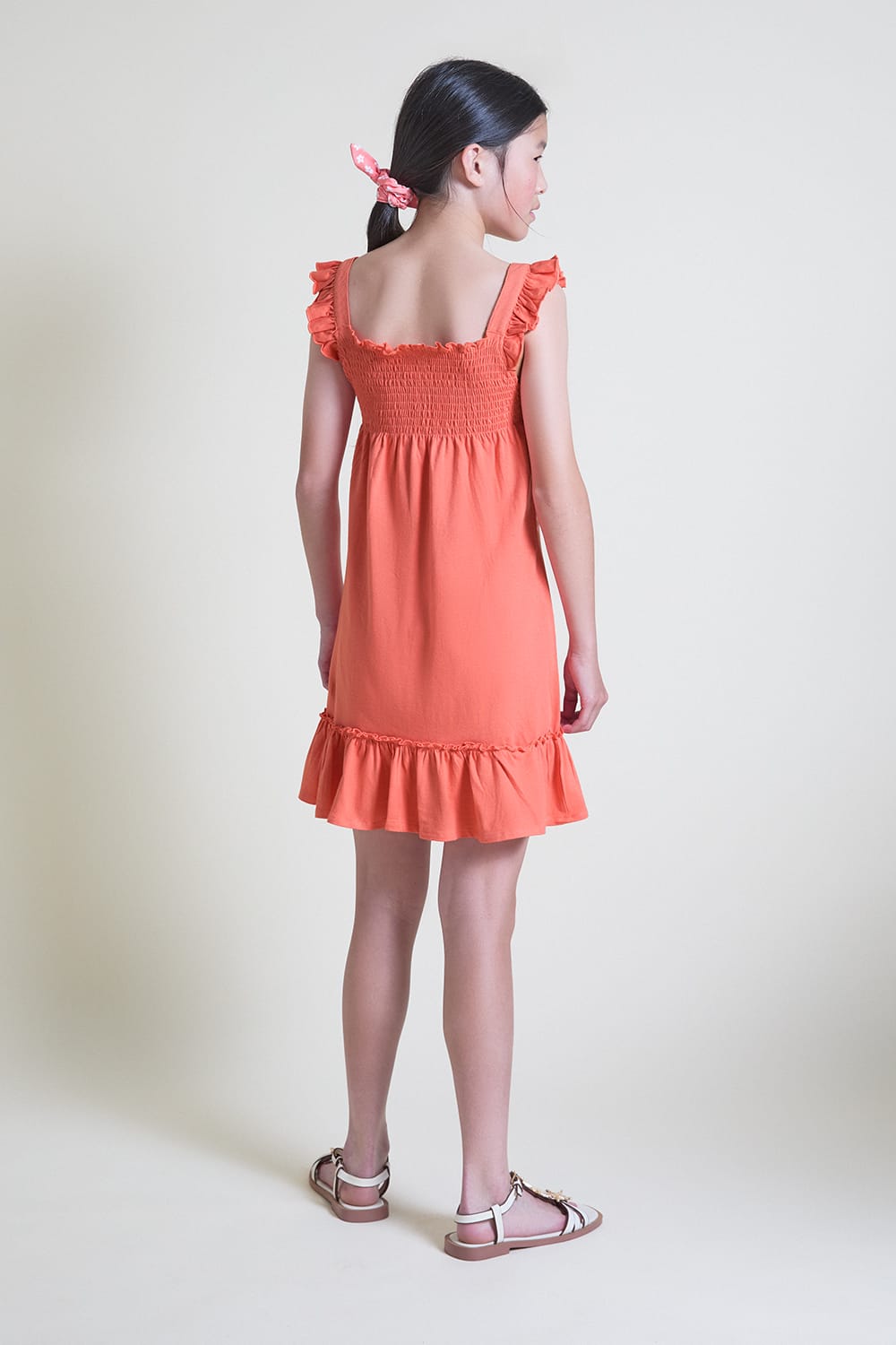 Vestido coral para niña con cuerpo fruncido y tirantes con volante. Cómodo, favorecedor y perfecto para verano.