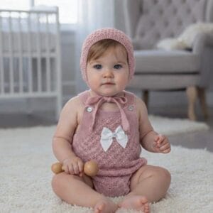 Pelele bebé de punto rosa con capota y lazo