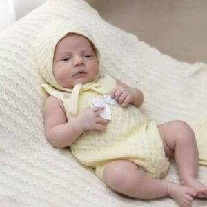Pelele bebé de punto amarillo con capota y lazo