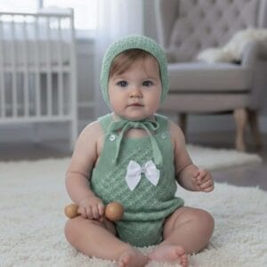 Pelele bebé de punto verde con capota y lazo